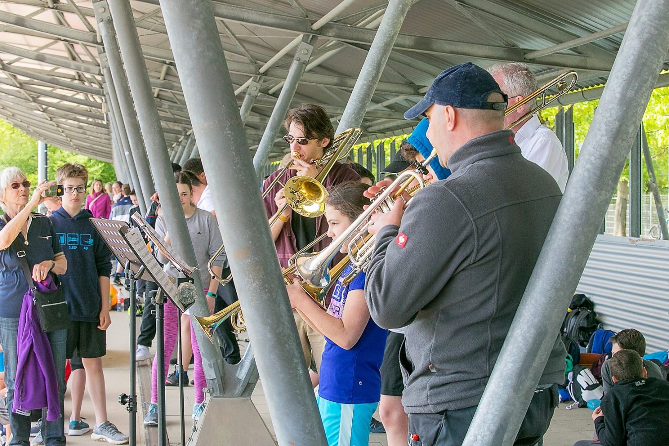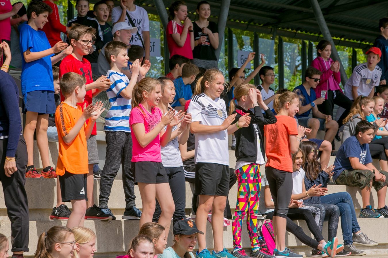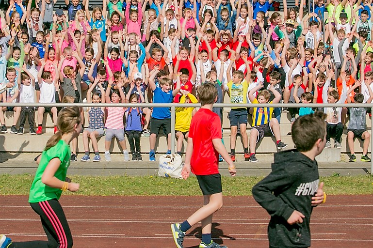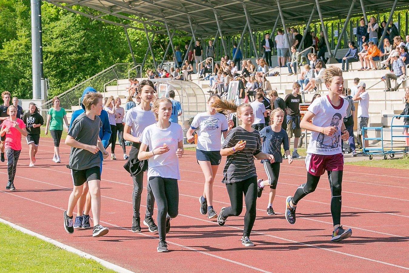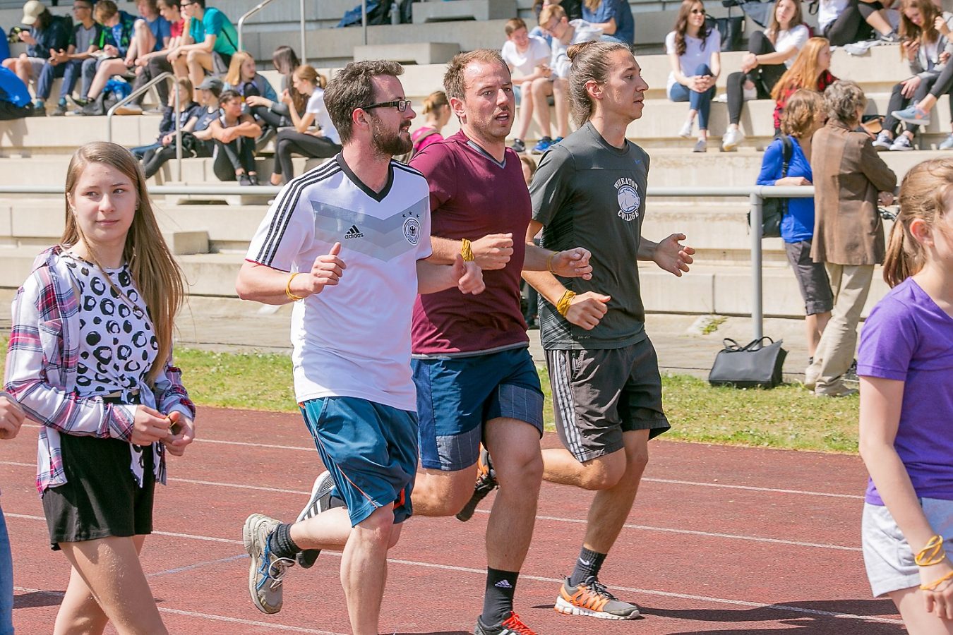 Der Erfolg hat viele „Mütter und Väter“: Das EMG Orga-Team, zahlreiche HelferInnen aus dem Kreis der SchülerInnen und Lehrkräfte, Polizei und Verantwortliche des Sportparks, Elternbeirat und Eltern, die für die Versorgungsstation sorgten, und natürlich die Läuferinnen und Läufer selbst, die sich bei jeder Runde mit Bananen, Äpfeln und Schokolade stärken konnten. Auch für Unterhaltung wurde gesorgt: Dank der „Stadionsprecherin“ Betina Mäusel (im Hauptberuf stellvertretende Schulleiterin des EMG), der flotten Musik von Lehrer-DJ Jürgen Wiesmeier und seinem Technik-Team sowie den „Bewegungskünstlern“ (unter Leitung von Sportlehrer Niklas Bartoschek) wurden Motivation und Stimmung den ganzen Vormittag lang befördert, so dass manch einer der Aktiven kaum noch zu bremsen war.