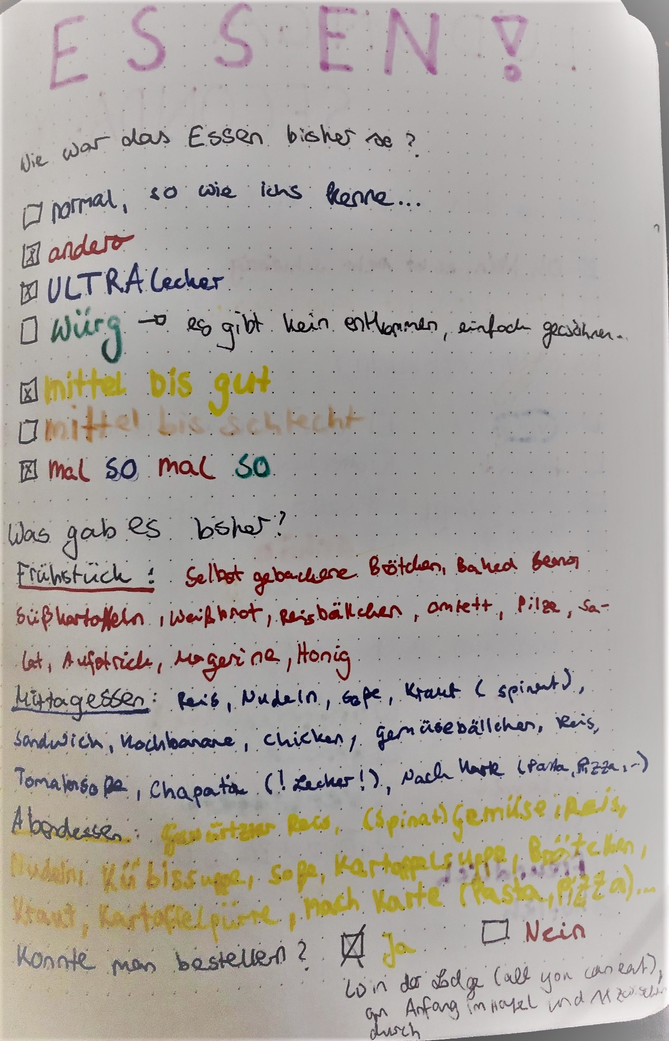 Leises Sprechen, vieles klingt auswendig gelernt, eigene Meinung wird oft nicht offen ausgedrückt, Schüler:innen vermissen ihre Familie, Lehrerin macht im Unterricht Witze, Schüler:innen antworten im Chor, alle sind an weiterem Kontakt interessiert, Schüler:innen dürfen sich aussuchen, mit wem sie ein Zimmer teilen, abends ist es oft zu laut (zum Einschlafen).