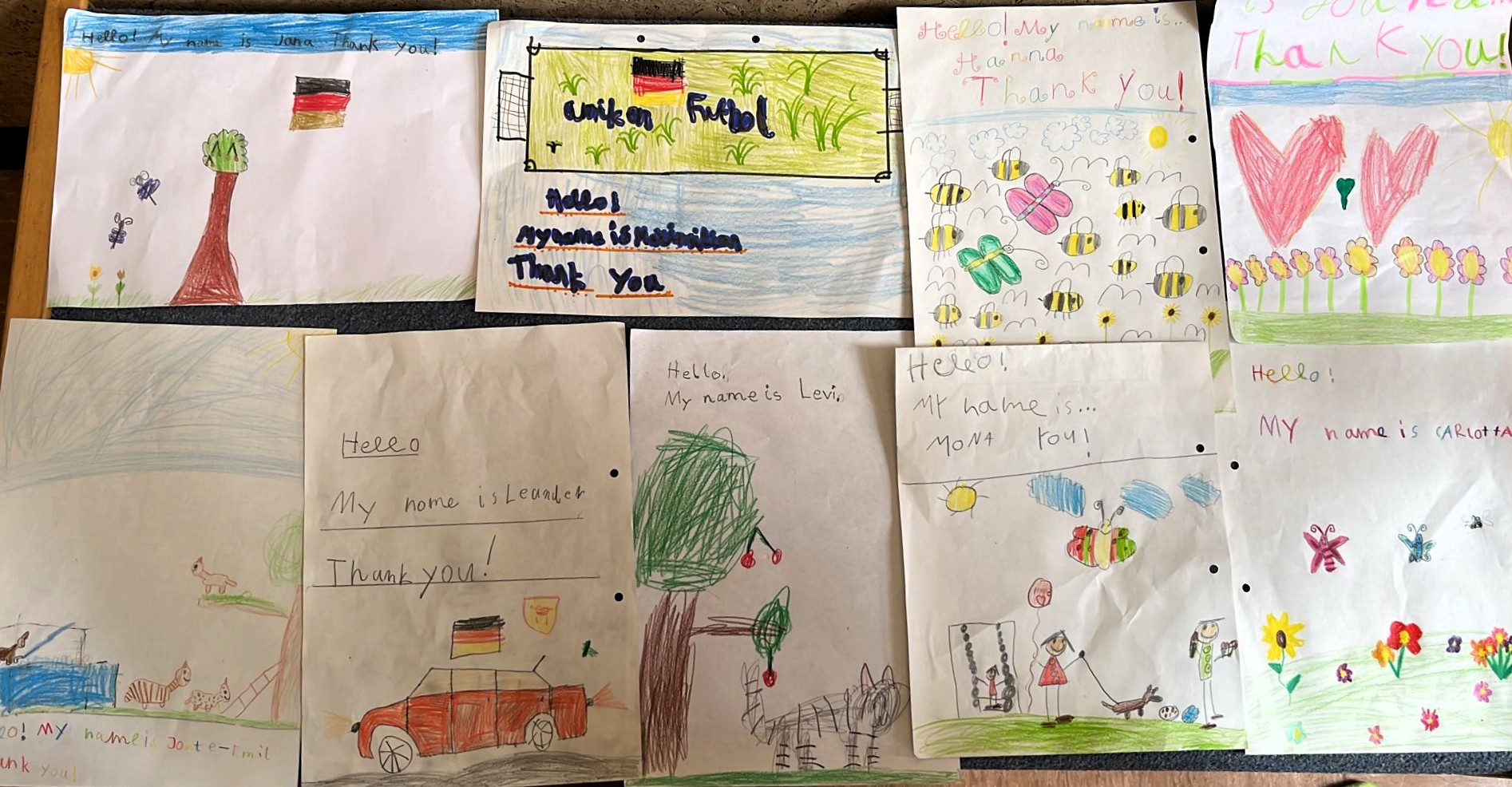 Damit beginnt nun für die Schulen der gemeinsame partnerschaftliche Weg der beiden dritten Klassen. Da der Austausch auf Englisch stattfindet und die Schüler:innen die englische Sprache gerade anfangen zu lernen, wurden zu Beginn selbst gemalte Bilder, kurze Vorstellungstexte und Fotos online hin und her gesendet.