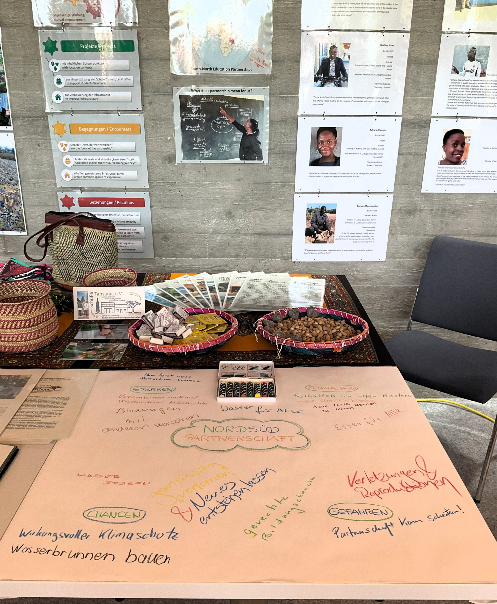 Von 10 bis 20 Uhr war SchuPa mit einem Infostand dabei: „Schenken Sie uns einen Gedanken und wir schenken Ihnen einen Apfel!“ So lud Edwin Busl die Besucher:innen ein, mit uns ins Gespräch über „Nord-Süd-Partnerschaften“ zu kommen. Aufgrund des kommerziellen Charakters der „Künstlermeile“ war das kein leichtes Unterfangen, aber es kamen tatsächlich recht sympathische Kontakte und konstruktive Gespräche zustande – auch dank der Unterstützung von Florian, Grete, Tomma, Theresa, Rubina, Saim, Rasmus und vor allem Christine Popa, die als Lehrerin SchuPa im neuen Schuljahr am EMG organisieren wird.